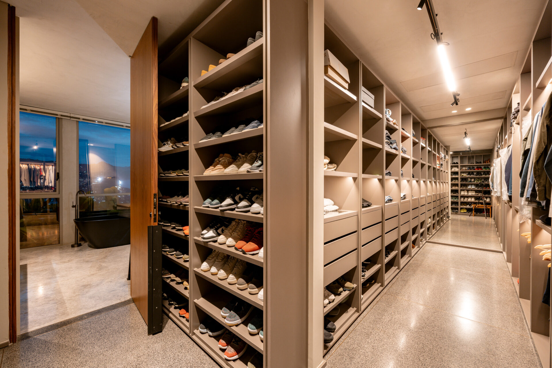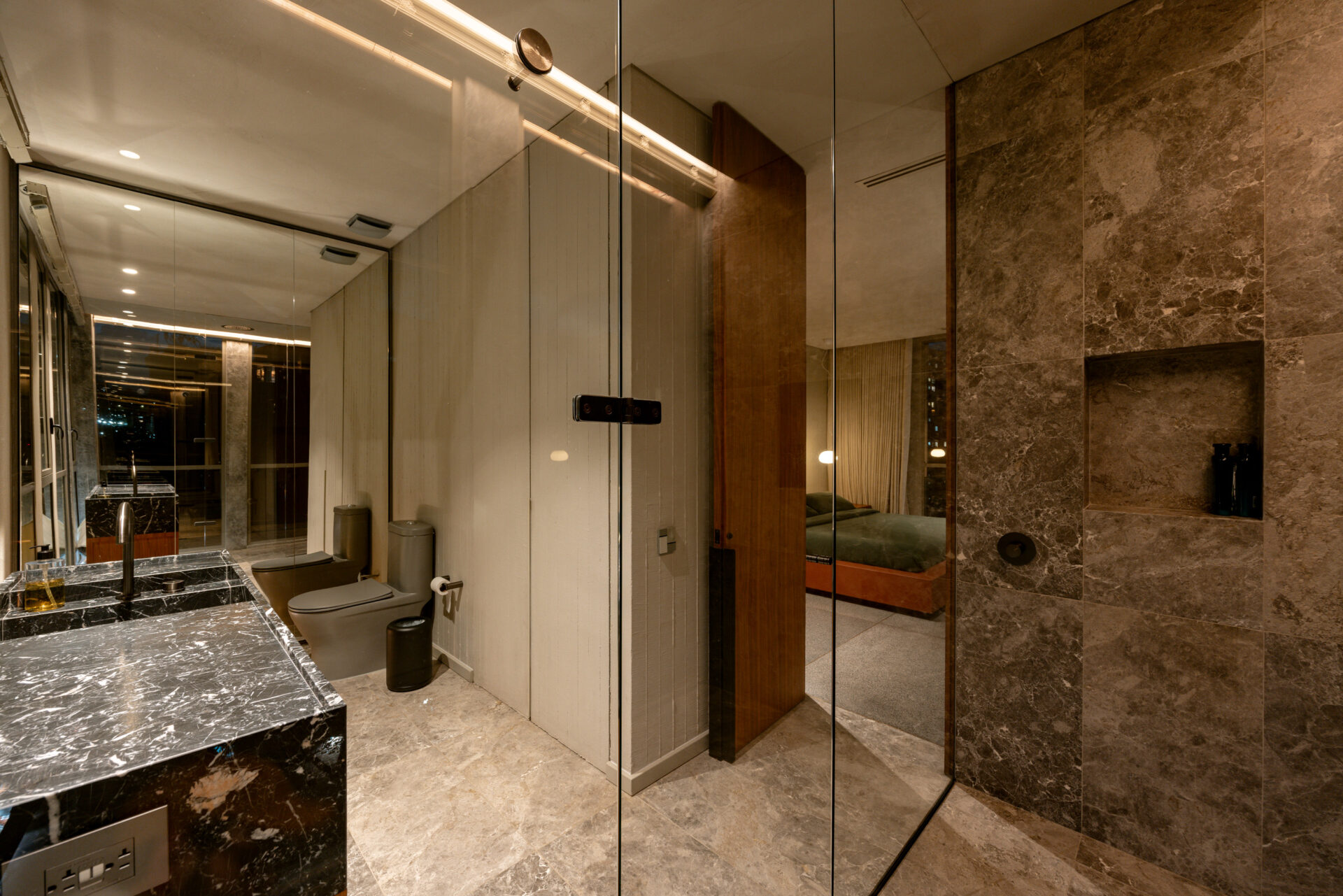 The layout features three spacious bedrooms, each with its own ensuite and closet, offering privacy and comfort. The master suite is a true sanctuary with a grand walk-in closet, a spa-like bathroom complete with a bathtub, and floor-to-ceiling windows framing sweeping views of the city. Natural light floods the interiors, enhancing both the architecture and the art-inspired atmosphere.