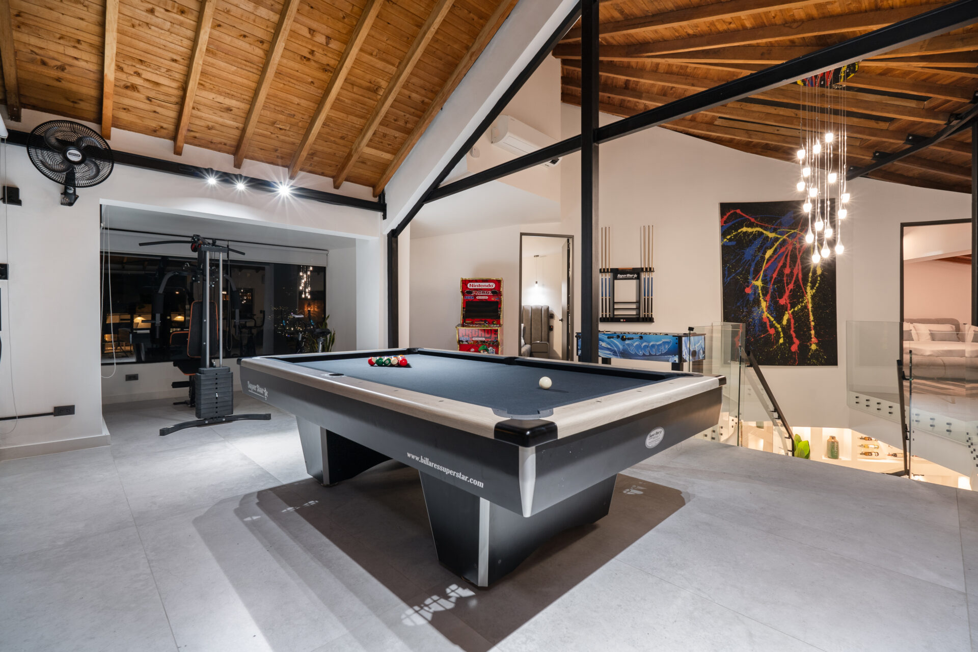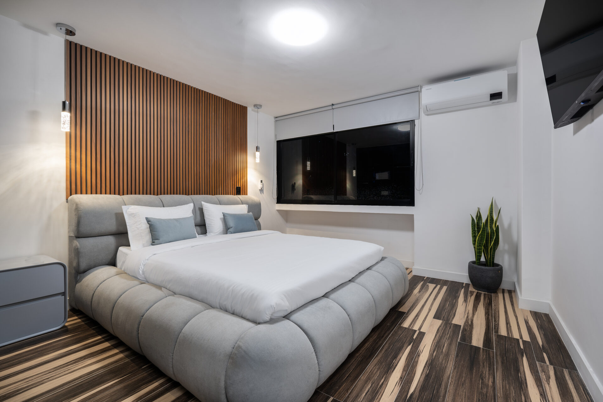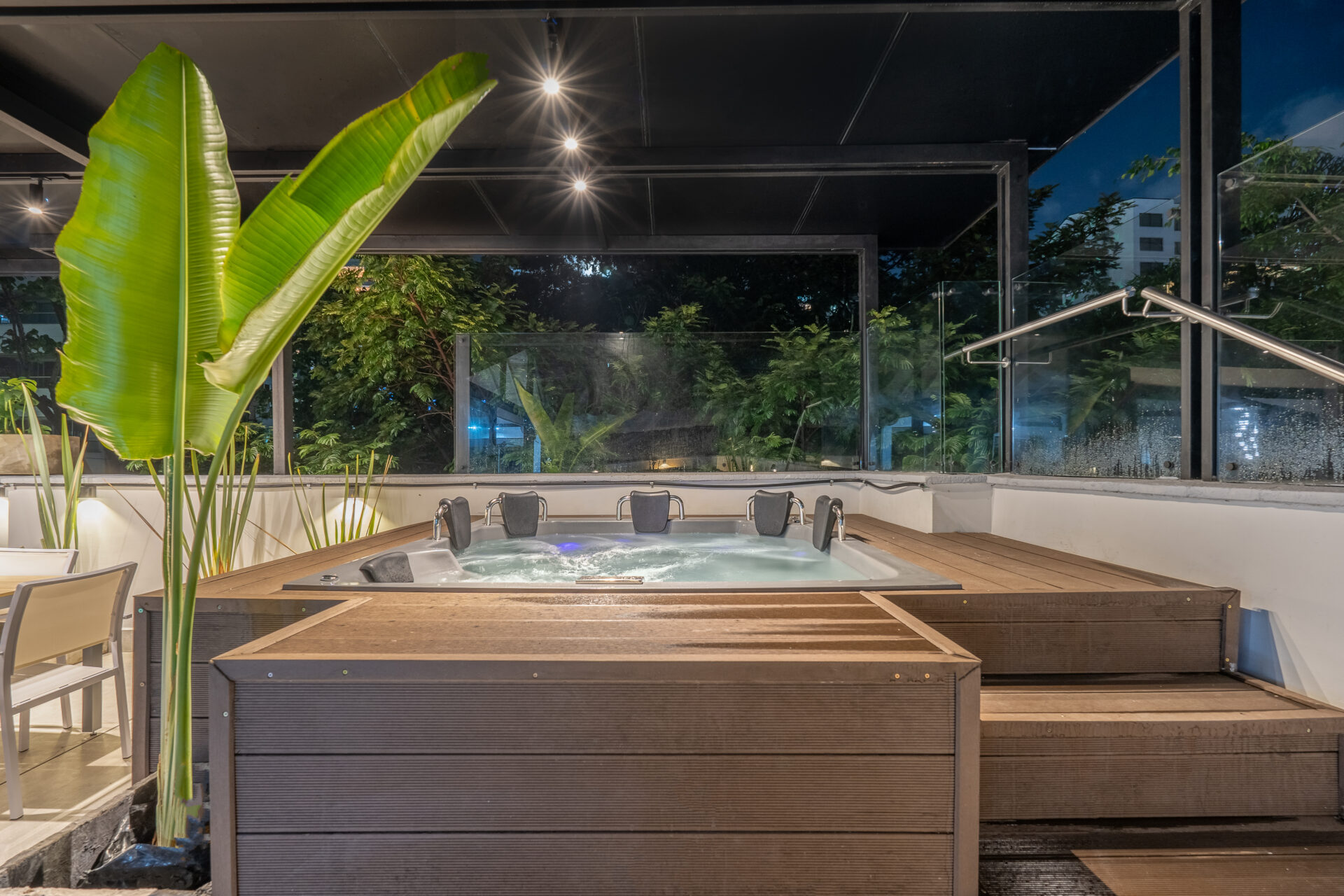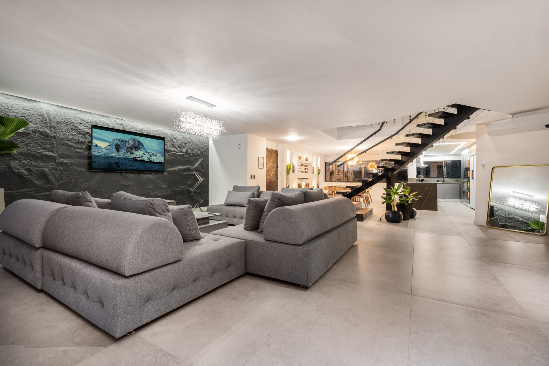 This spacious 400-square-meter duplex penthouse is designed for both comfort and profitability, ideal for daily rental use. It offers five bedrooms, five bathrooms, and an additional guest bathroom, all distributed across two levels with functional, well-planned spaces. The unit includes a jacuzzi, sauna, yoga room, small gym area, pool table, and air conditioning in every bedroom, ensuring a high standard of comfort for residents and guests alike. Surrounded by lush green views, it provides a relaxing and private atmosphere.