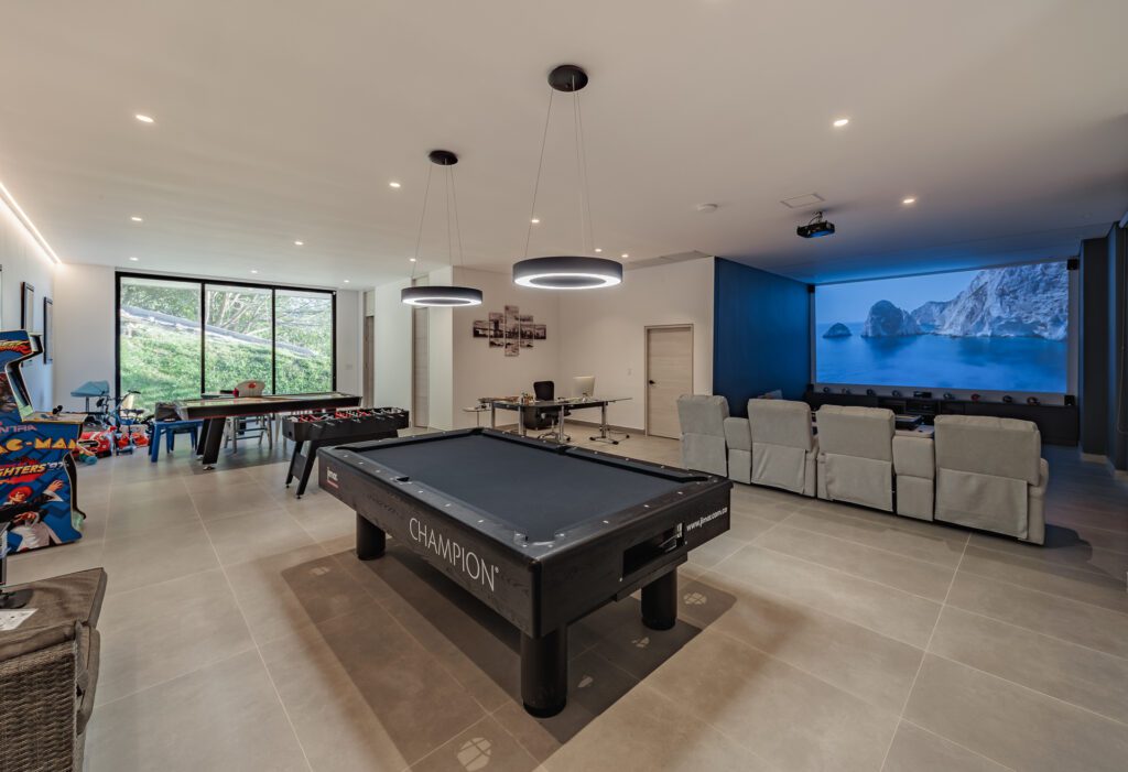 Soaring double-height ceilings add to the sense of openness and architectural elegance. The home also boasts a private man cave, a heated swimming pool, and a jacuzzi, offering the perfect setting for both relaxation and social gatherings. State-of-the-art home automation and an integrated sound system ensure maximum comfort and convenience, while the entertainment room provides the ultimate space for movie nights or hosting guests.