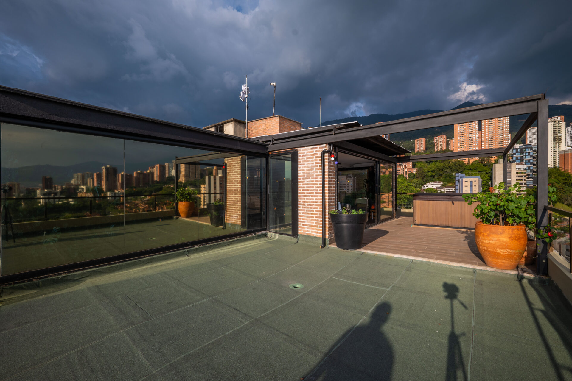 This renovated three-story penthouse offers 250 square meters of interior space along with a 150 square meter private terrace. The property includes three bedrooms and three and a half bathrooms, designed with both functionality and modern comfort in mind. High ceilings of 9.5 feet, expansive windows, and open layouts enhance the sense of space while framing panoramic views of Medellín.