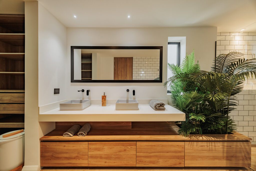 The apartment features three spacious bedrooms, each with its own ensuite bathroom, providing ultimate privacy and comfort. In addition, there are two extra bathrooms for guests, totaling five bathrooms throughout the space.