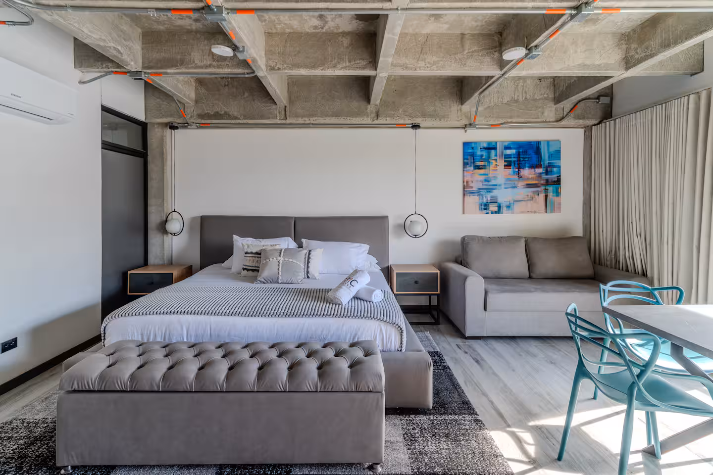 This 46 m² loft-style apartment features an industrial design with an open ceiling, creating a modern and spacious atmosphere. The unit includes one bedroom, a balcony, a storage room, and one parking space. It is offered fully furnished and currently operates as a daily rental, making it an ideal turnkey investment.
