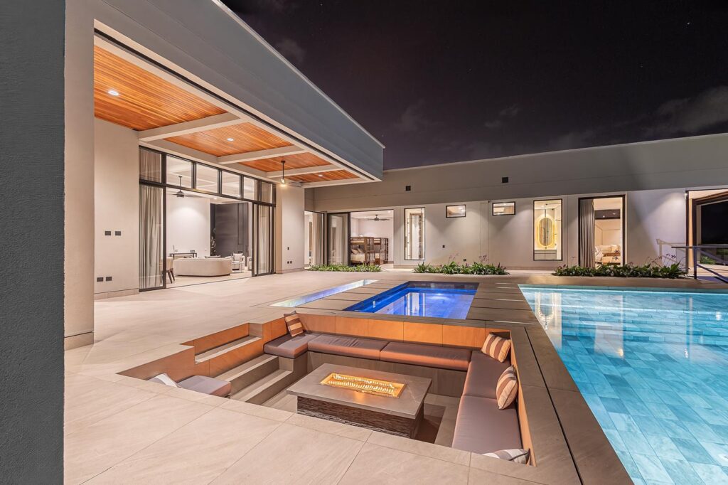 Outdoor areas are designed for entertainment and relaxation, including a 12-person firepit, an infinity pool with panoramic views, a 14-person jacuzzi, and a covered BBQ area. Infrastructure is in place for optional installation of solar panels, air conditioning, and home automation systems. The landscaping includes green zones and a rainwater collection system ready for irrigation or secondary uses.