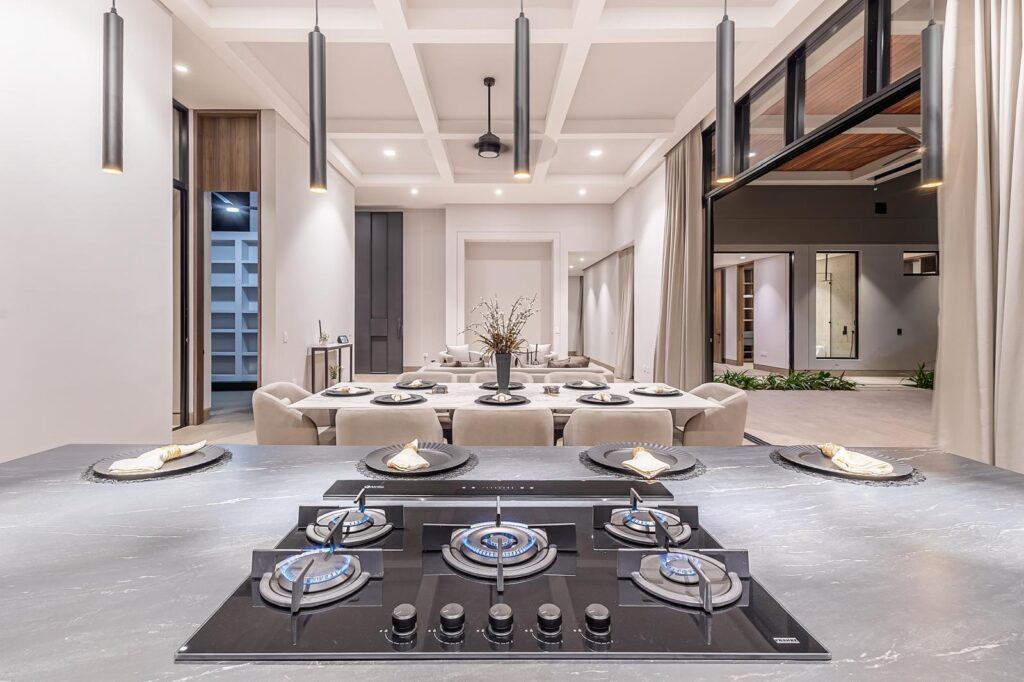The home features 3 bedrooms, each with an en-suite bathroom and walk-in closet, as well as a service or guest suite with full amenities. It includes a TV room, study, indoor and outdoor social areas, a fully equipped kitchen with marble-style countertops and built-in appliances, gym space, laundry room, internal storage, and two additional utility rooms. High ceilings and large windows in dark aluminum frames promote air circulation and natural light throughout. The property also includes a covered garage for 3 vehicles and additional uncovered parking for up to 10.