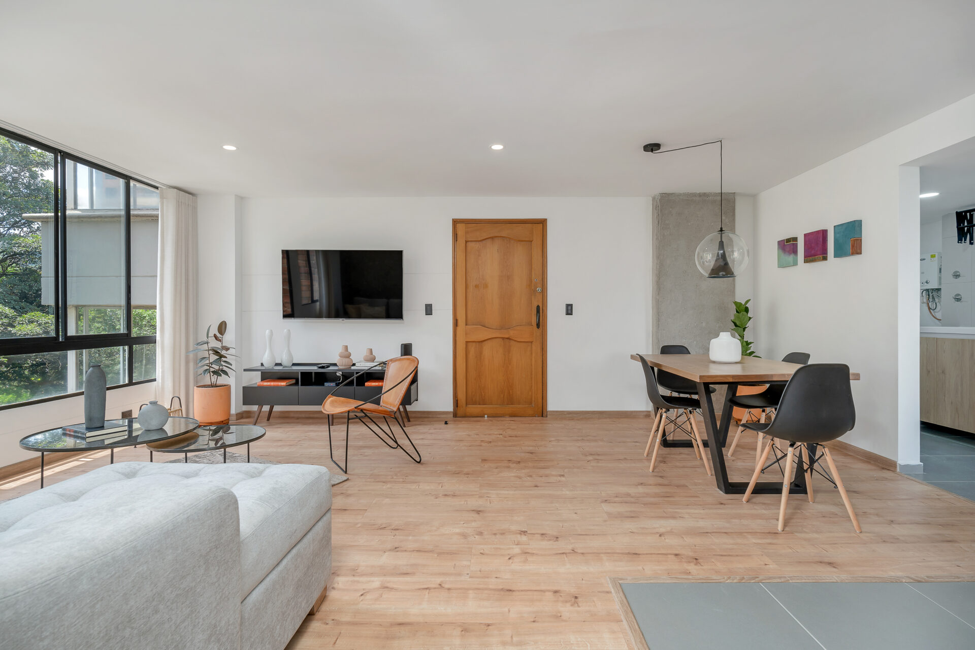 - Bright living room with Smart TV and dining area.