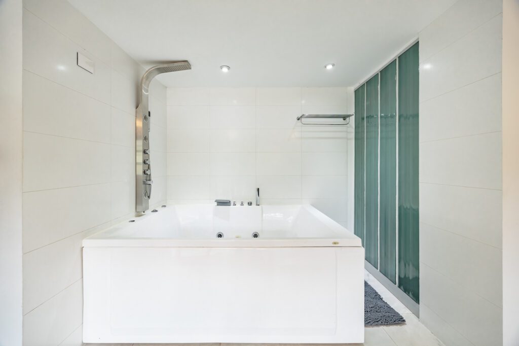 The primary bedroom boasts a king-size bed, a private bathroom with a shower/jacuzzi combo, a Smart TV, and a portable air conditioner for personalized comfort. The second bedroom features a queen-size bed, its own Smart TV, a cozy reading nook, and a complete en-suite bathroom. The third bedroom, though smaller, offers a comfortable double bed and an en-suite bathroom for added privacy.