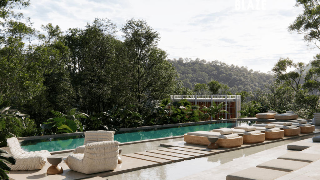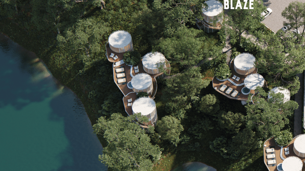The architectural vision for BLAZE is rooted in “Conscious Luxury,” utilizing an organic grouping model inspired by mycelium to harmonize with the surrounding landscape. The project spans 25,000 m2 of prime lakeside land and features a bold, modular design focused on the pillars of interaction, flexibility, and privacy. This 60-room boutique development offers unique typologies, including the innovative Hongos (Mushroom) modules—available in Premium, Medium, and Single configurations—alongside two types of lofts, all designed to offer a seamless integration of nature and architecture.