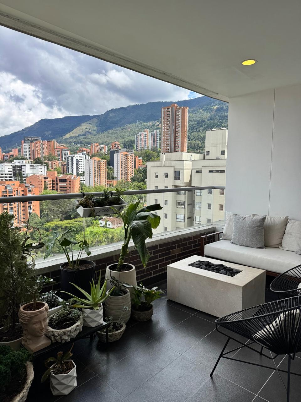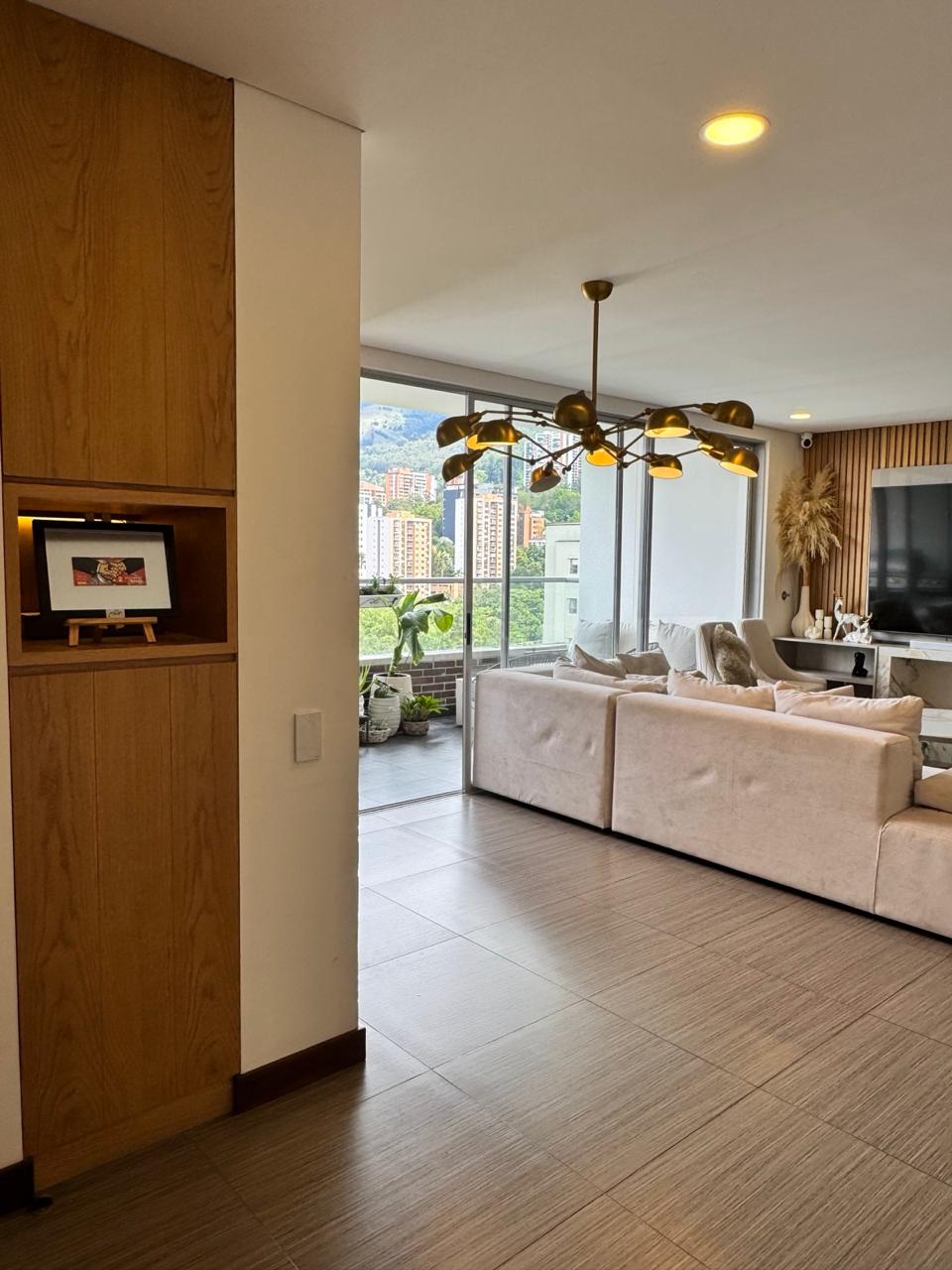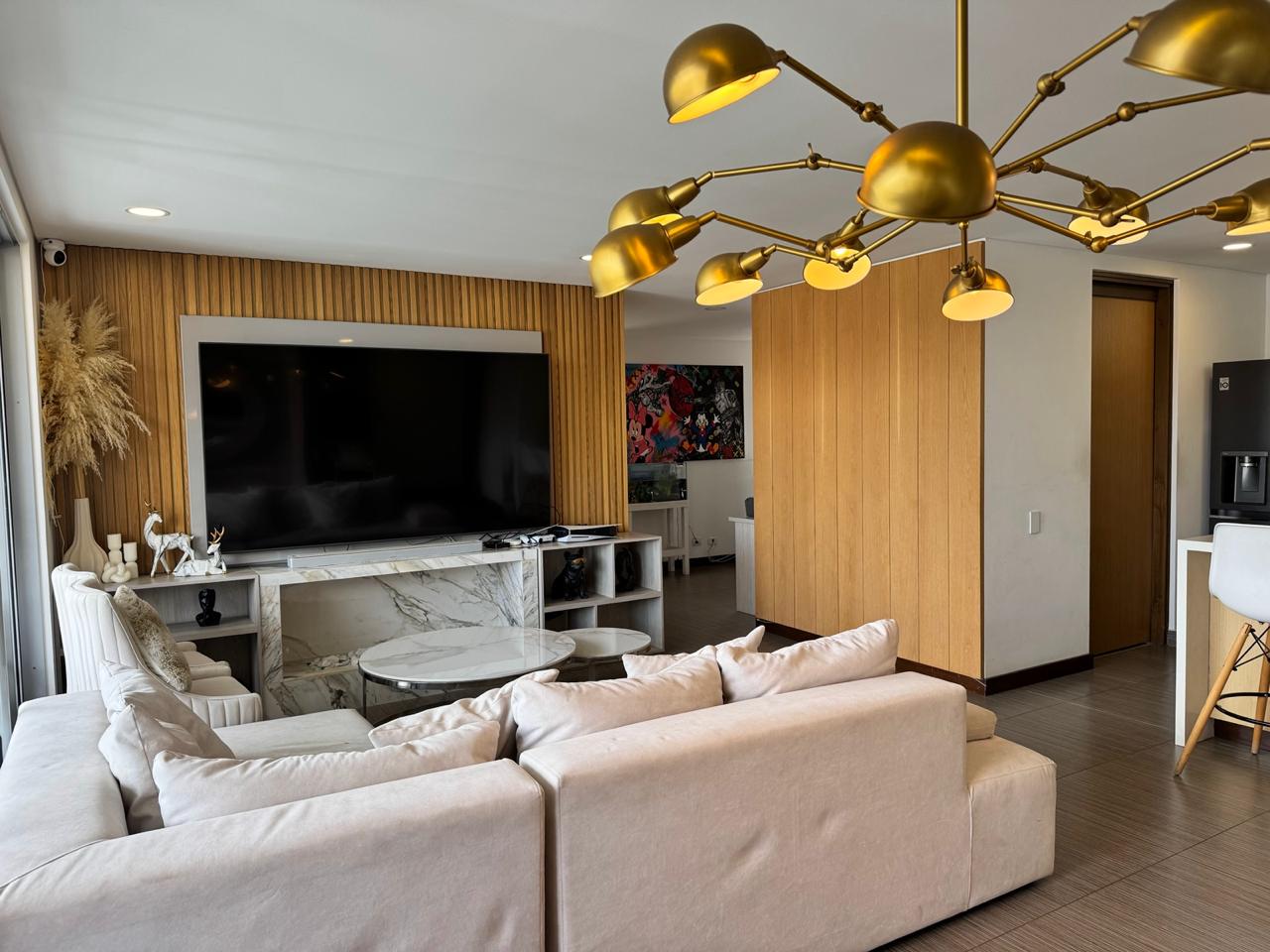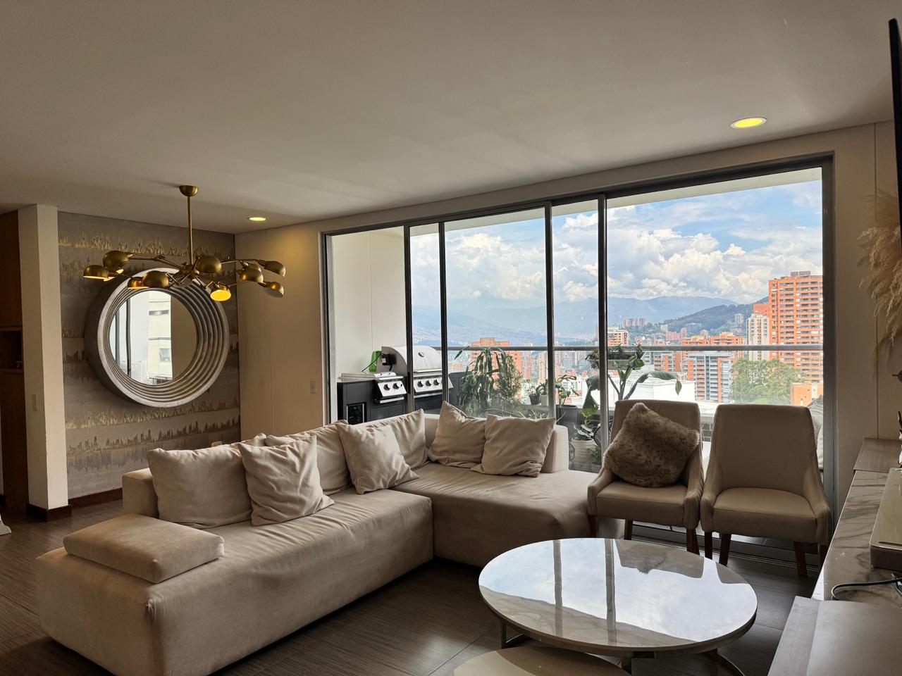 This top-floor residence is located in a premier sector of El Poblado, offering a sophisticated living environment with expansive panoramic views of the Medellín skyline and surrounding mountains. The apartment spans 129 m² and features a modern architectural layout designed to maximize natural light and ventilation through floor-to-ceiling glass sliding doors.
