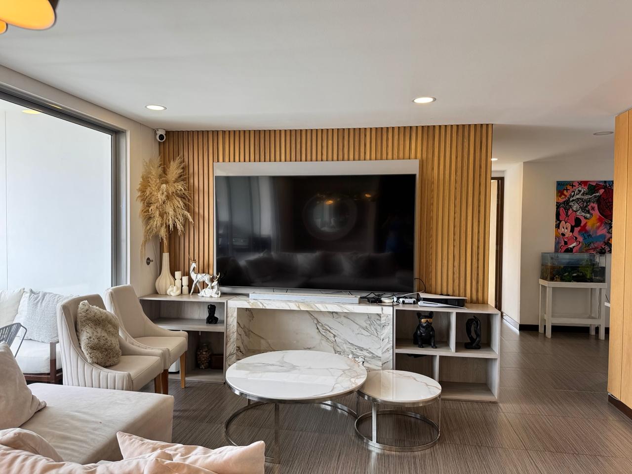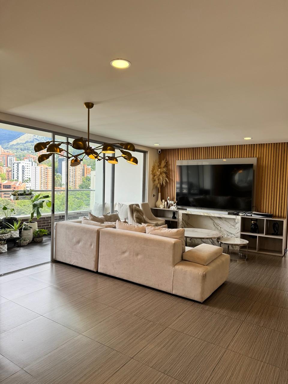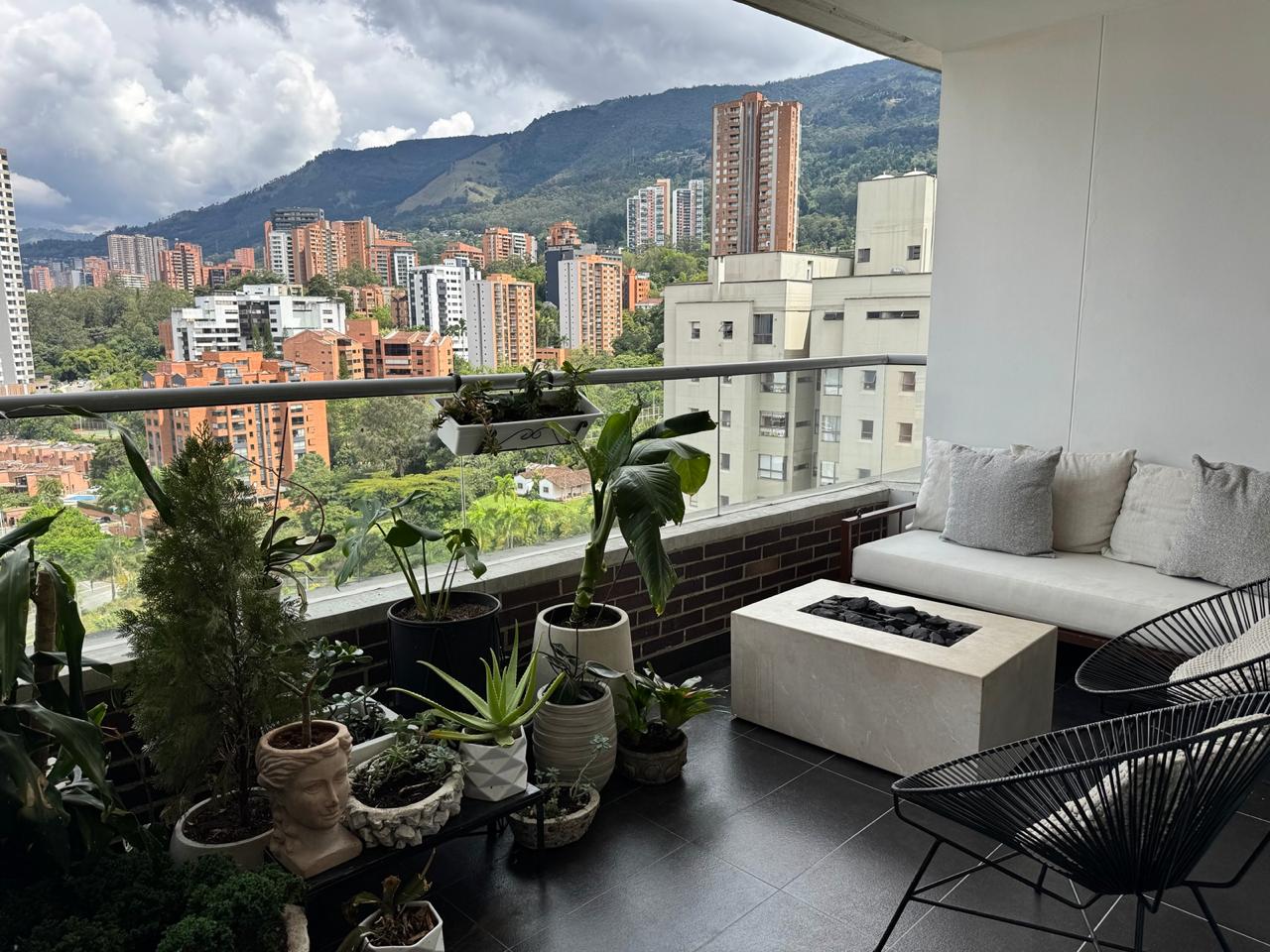 This top-floor residence is located in a premier sector of El Poblado, offering a sophisticated living environment with expansive panoramic views of the Medellín skyline and surrounding mountains. The apartment spans 129 m² and features a modern architectural layout designed to maximize natural light and ventilation through floor-to-ceiling glass sliding doors.