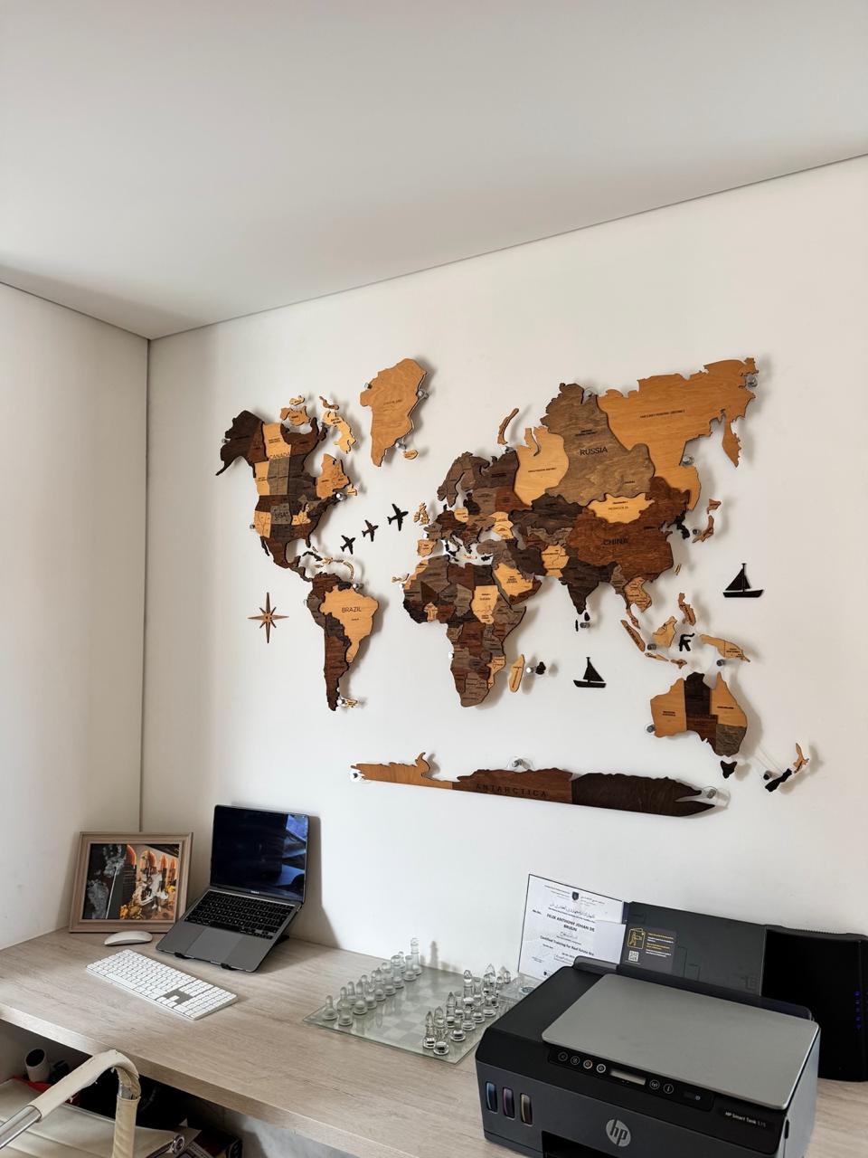 The interior configuration includes two bedrooms and three bathrooms, finished with high-quality materials such as wood-textured porcelain flooring and sleek cabinetry. The social area is composed of an open-concept kitchen equipped with stone countertops, a breakfast bar, and integrated appliances, flowing seamlessly into the main living and dining spaces. High-end lighting fixtures and wood-slat wall accents provide a contemporary aesthetic throughout the primary areas. A standout feature of this property is the expansive, private balcony. Additional functional spaces include a dedicated home office area and a laundry zone.