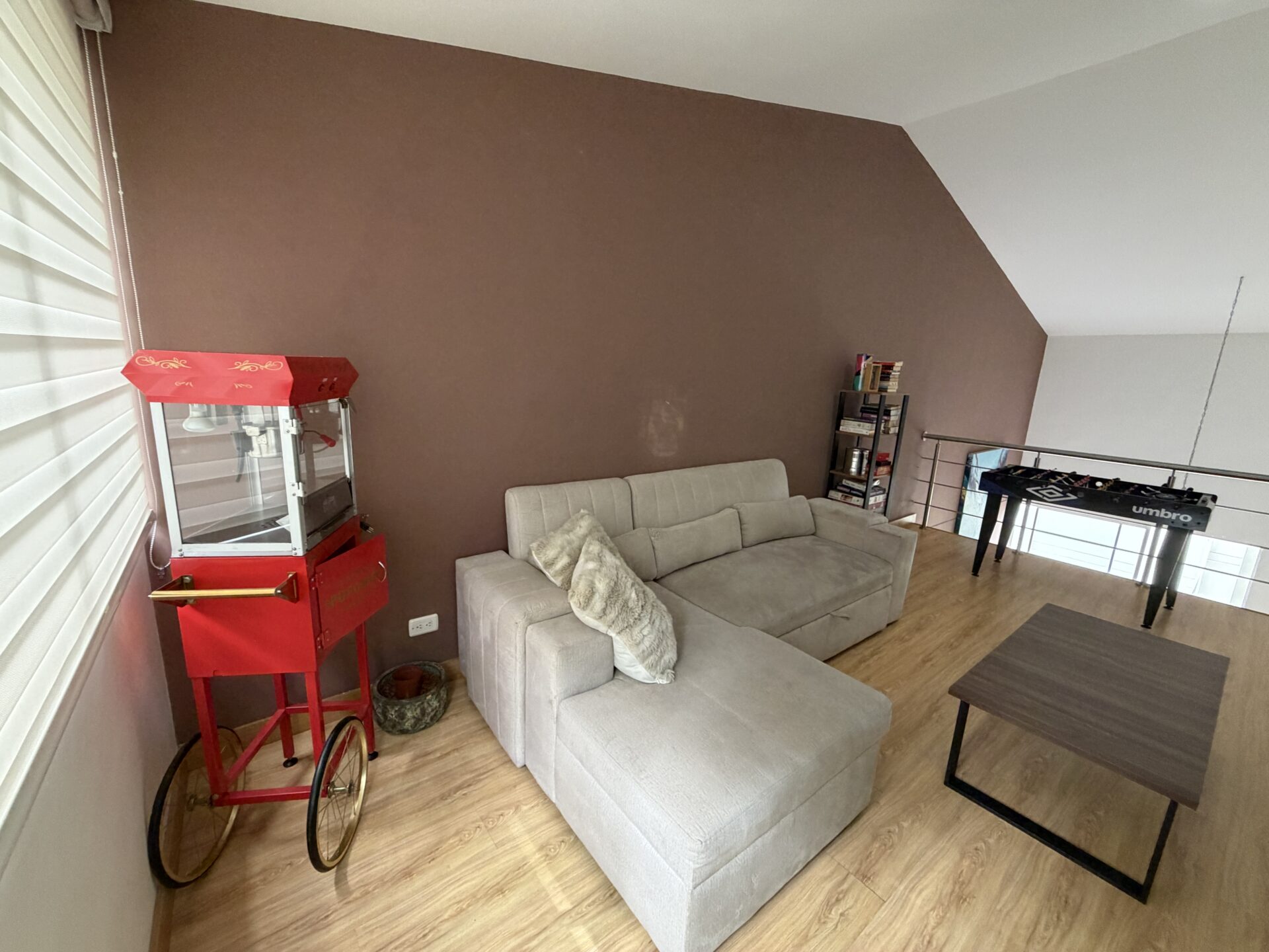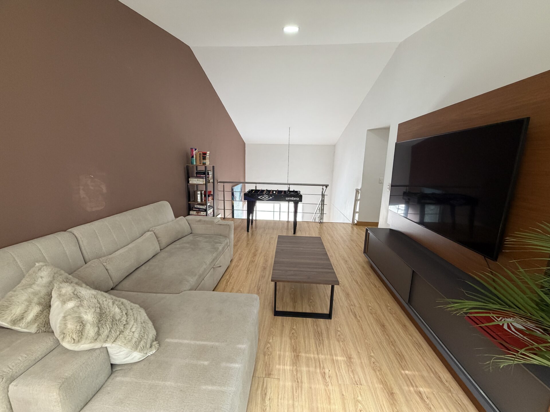 The first level is designed for social interaction and comfort, centered around a contemporary open kitchen that integrates seamlessly with the living and dining areas. A standout feature of this property is the large L-shaped terrace on the first floor, which serves as an expansive outdoor extension of the main living space, ideal for entertaining while overlooking the city. The dual-level structure ensures a clear separation between the high-traffic social areas and the more private quarters on the upper floor.