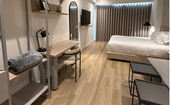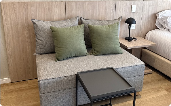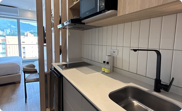 The apartment features air-conditioning, a kitchenette, balcony with city views, private bathroom, kitchen, coffee machine, dining area, sofa bed, and free toiletries. Additional amenities include a work desk, microwave, TV, and toaster.