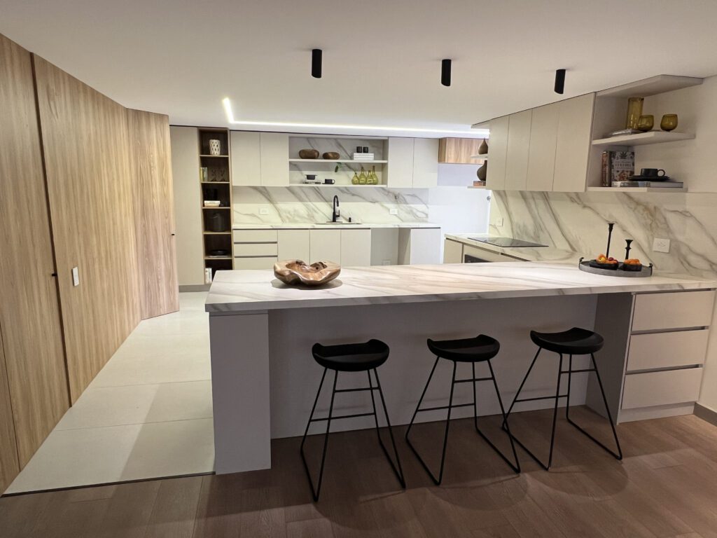 This spacious 4-bedroom apartment, with a total area of 422 square meters, includes a 275 square meter built space and a 147 square meter terrace. The unit features six bathrooms, an additional studio, and an open kitchen.